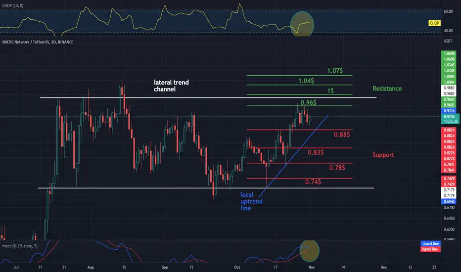 Hello everyone, let's take a look at the MATIC to USDT chart on the 1D interval. As you can see, the price moves in the sideways channel and locally above the uptrend line.