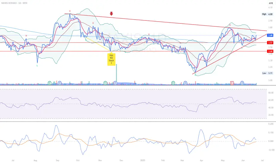 The plan is to take profit at RM4.01, which sits near the upper resistance line, while the stop loss is set at RM3.44 to protect against downside risk.