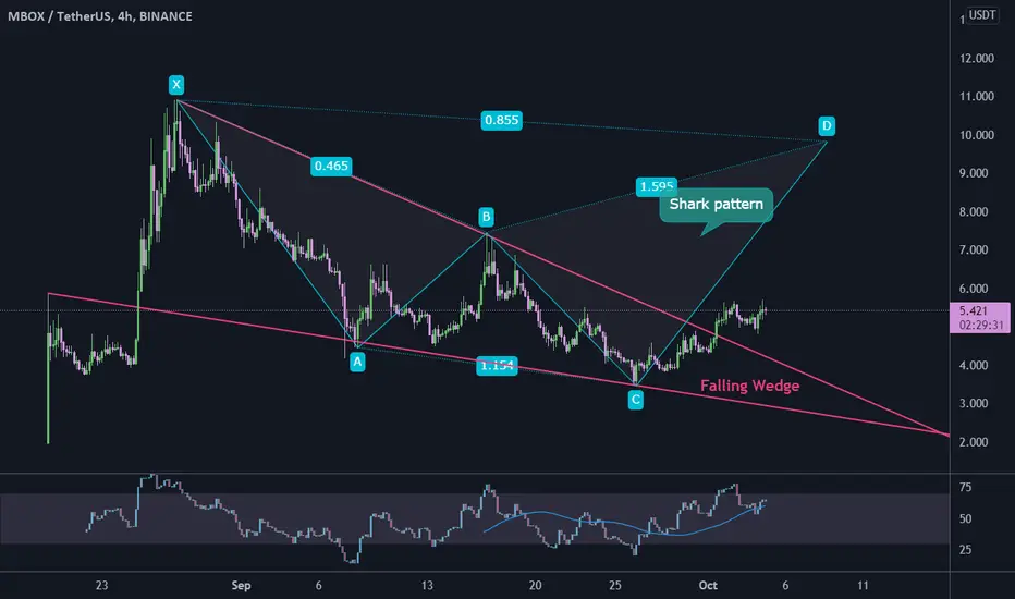 MBOX price has broken out from falling wedge, that is a bullish pattern, also it can head up to complete shark pattern, that is around 80% increase from here.