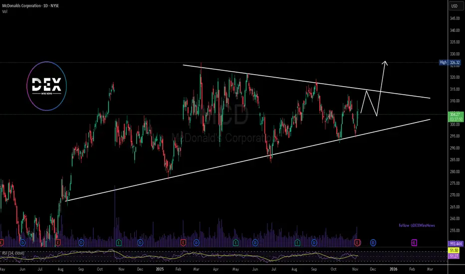 As of the latest close, MCD trades near $304, consolidating just above the ascending trendline that has supported the price since mid-2024. The upper resistance trendline lies near the $315–$320 range, where previous rally attempts were rejected. A clean breakout and daily close above this level could unlock further upside toward the $326–$330 zone, aligning with prior highs and the chart’s projected target from the triangle pattern.