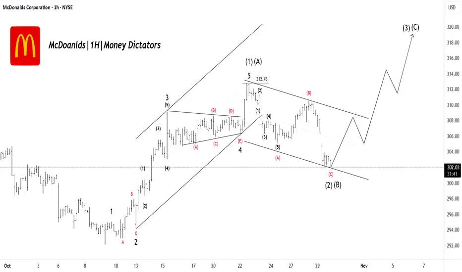 McDonald’s has completed a clean 5-wave push to the upside, finishing Wave (1)/(A) near the recent high. After that, price entered a corrective channel forming an A-B-C pullback, which now looks close to completing as Wave (2)/(B). The drop is losing momentum near support, suggesting sellers are running out of strength. Once this correction finishes, the chart expects a sharp bullish move into Wave (3)/(C), targeting higher levels above recent highs. In simple terms: correction almost done → strong upside continuation likely.