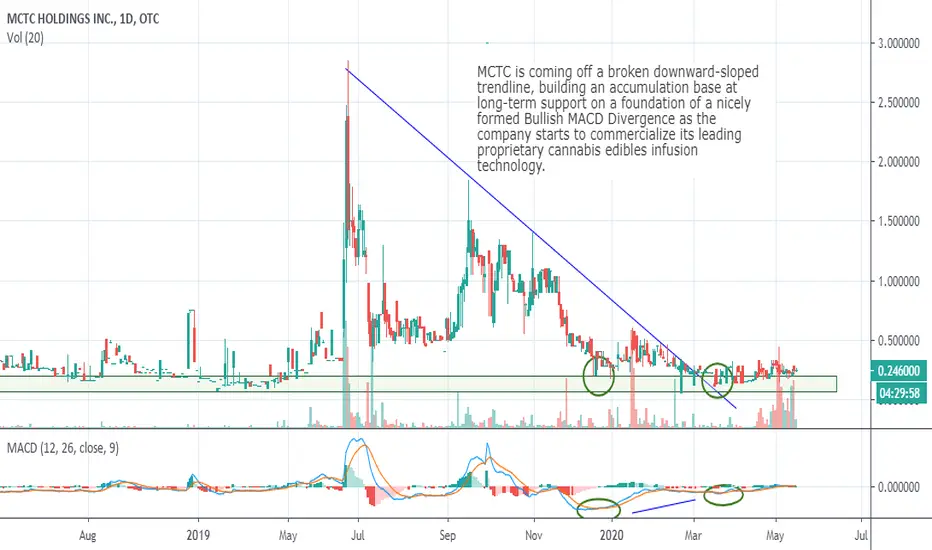 $OTC:MCTC is coming off a broken downward-sloped trendline, building an accumulation base at long-term support on a foundation of a nicely formed Bullish MACD Divergence as the company starts to commercialize its leading proprietary cannabis edibles infusion technology.