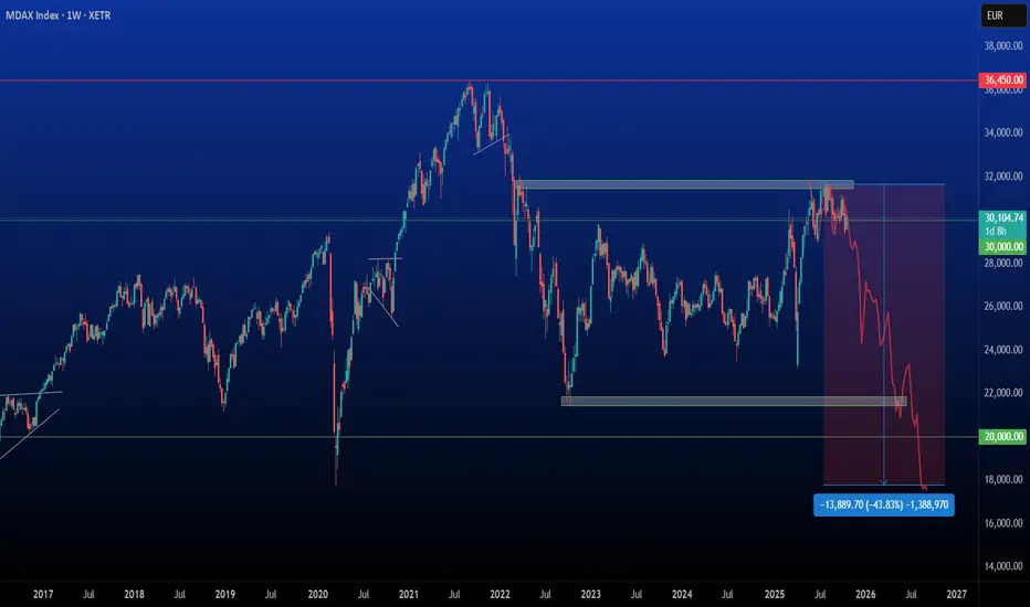 Technically, the MDAX appears to be encountering strong resistance at current levels and may remain range-bound toward the lower end of its 2025-2026 trading band. My medium-term target is a retest of the 2020 COVID-era lows. If Germany’s recession fears materialize more forcefully, the downside potential could extend even further.