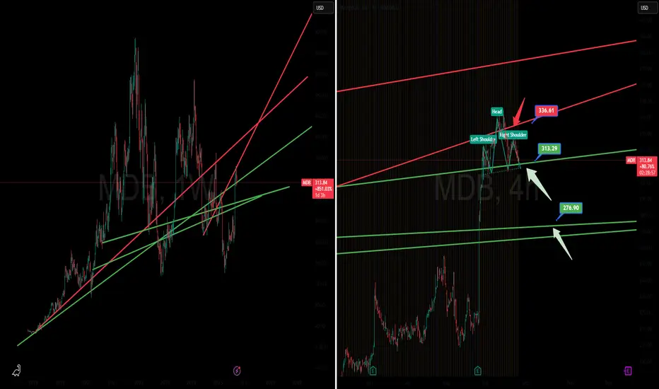 Initial Downside Target (Green Box): A projected target level, likely derived from the H&S pattern's measurement, is marked at $276.90. This level is also aligned with a lower support trendline on the 4h chart.