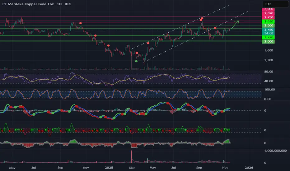 MDKA, signalling potential upside after consolidation. A close above 2,700 IDR (right rim/resistance) on higher volume would validate. Reversal from downtrend; adds confluence to cup.