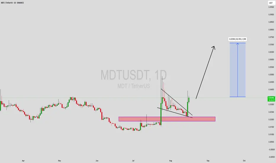 With good volume already observed on recent candles, the chances of a bullish breakout are increasing. The descending triangle pattern has been developing over time, and the current positioning near the breakout level is promising. If MDTUSDT breaks above the resistance zone, a strong rally toward the projected 90% to 100% gain is highly probable, especially considering growing investor interest in the project.