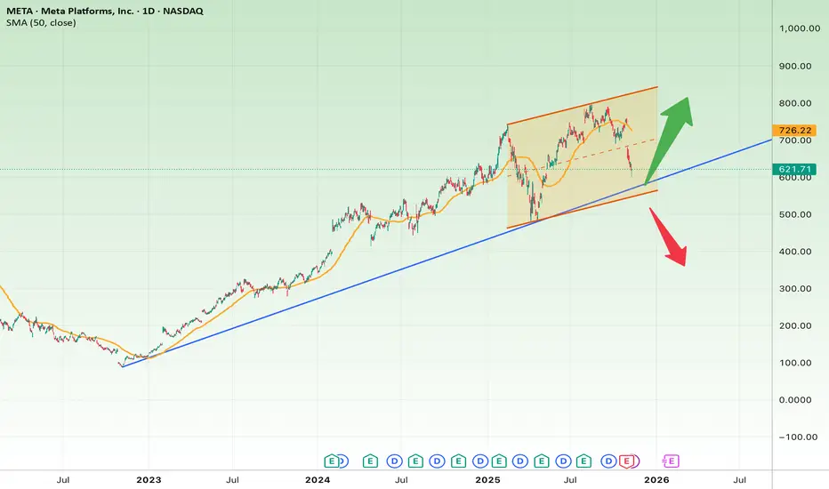 On the daily chart, META stock has been trading within a rising short-term channel after a strong uptrend from early 2023 to mid-2024. The price is now around $620, approaching the main long-term uptrend line (blue) drawn from the 2023 lows — a critical level that also aligns with the 50-day moving average (SMA50).