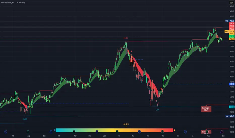 Resistance overhead: META hit a wall at $796.25 (previous high) and pulled back sharply. Until price reclaims that area, it’s a ceiling.