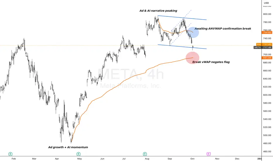 On the 4H chart, META’s bullish flag structure has retraced toward anchored VWAP support. The $754 anchored VWAP is the key decision point: