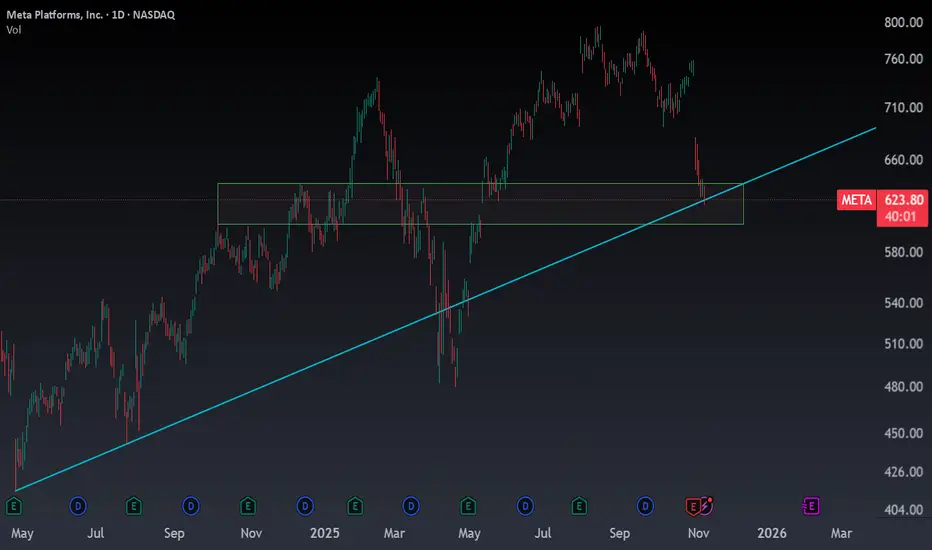 Alright, let’s keep it short and sweet! Meta (META) is at $624.35 after a 20%+ drop from its peak, but the chart’s upward trendline is still intact, hinting at a potential reversal. That dip to the $623-$625 support zone