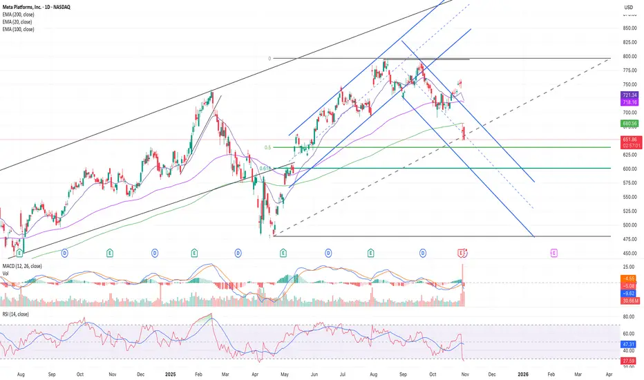 META is trading inside a descending channel after breaking its main uptrend. Price recently rejected the upper boundary with strong sell volume and a bearish MACD crossover, showing short-term weakness.