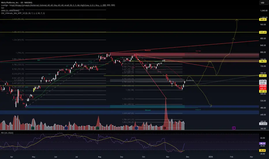 Bull Path: Hold 625–630 → reclaim 665 → expansion toward 748 liquidity pocket, then continuation toward 915 and 989 HTF targets.