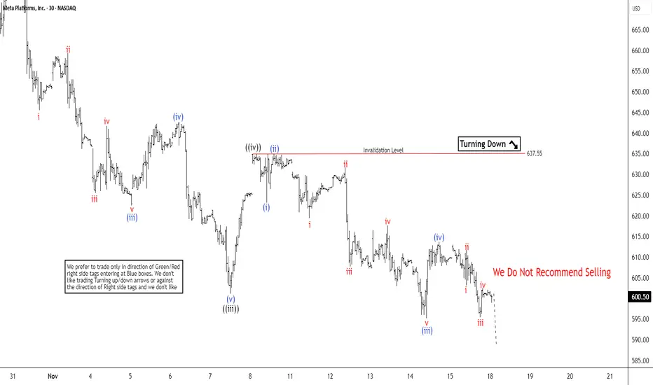 The short-term Elliott Wave outlook for META indicates that the cycle from the October 29 high remains in progress, unfolding as a five-wave impulsive structure. From the October 29 peak, wave ((i)) concluded at $650.17. A corrective rally in wave ((ii)) then followed which terminated at $680.96. Subsequently, the stock declined in wave ((iii)), reaching a low of $601.20. A rebound in wave ((iv)) then ended at $637.55, as illustrated in the 30-minute chart.