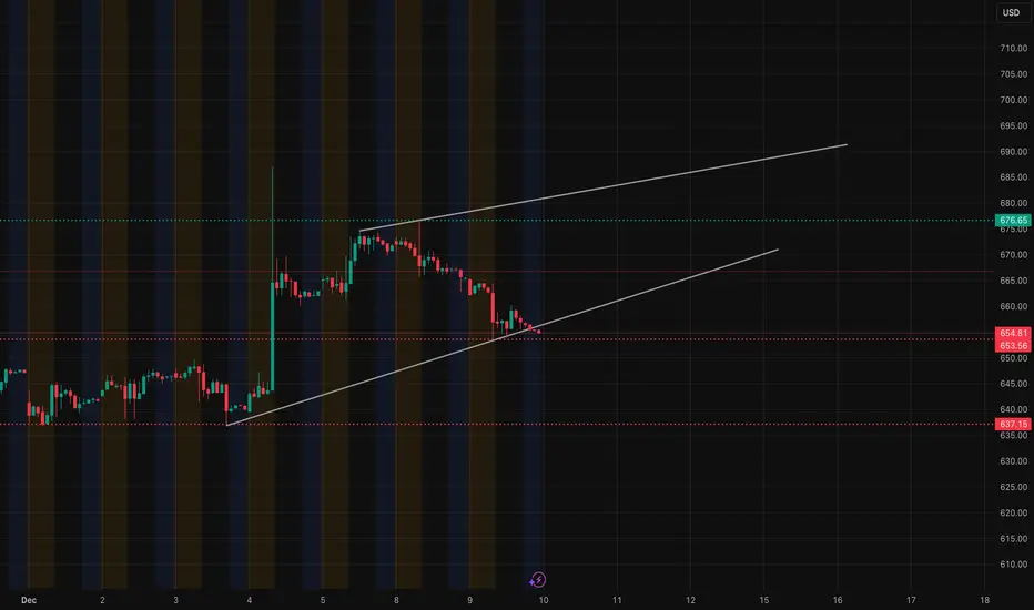 On the 15M chart, price has been compressing under a descending trendline. Sellers have the upper hand intraday — every bounce is getting sold off quickly, and the tape keeps drifting back toward the red liquidity zone at 653–654. META needs to reclaim the breakdown zone near 662–665 to flip the tone back to bullish; otherwise, the structure is still leaning downward.