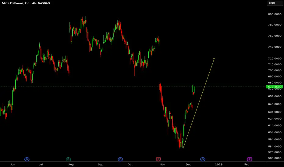 META has recovered sharply from its recent drop, and the structure now hints at a developing continuation phase. The current climb may still be part of a broader move forming to the upside, with momentum showing signs of strength. As price builds within this emerging pattern, the next leg could unfold once the short-term consolidation completes, making this an intriguing chart to watch for follow-through.