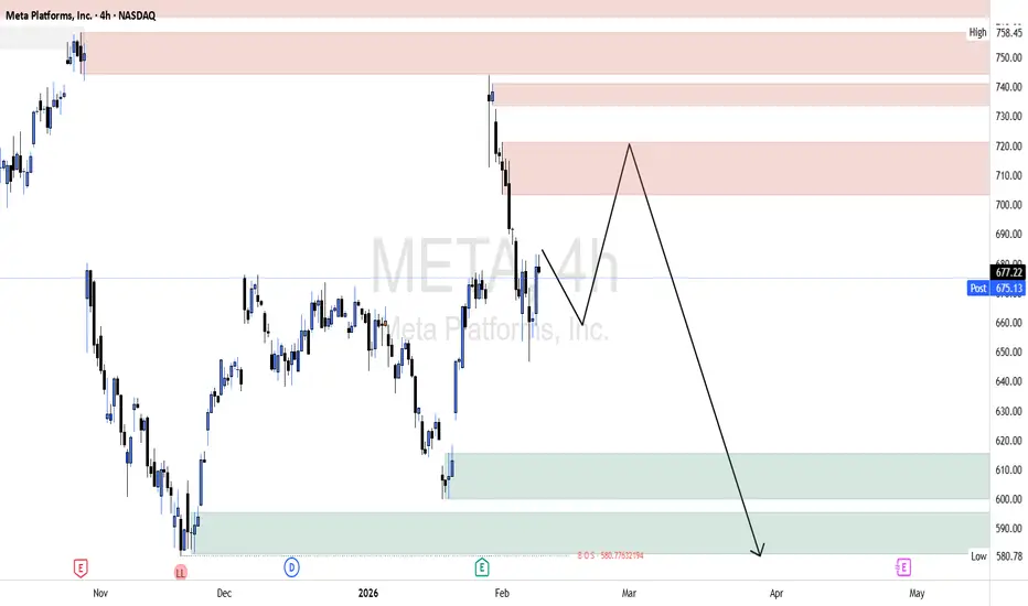From a supply and demand perspective, META is currently trading below multiple stacked supply zones. The most relevant supply sits between roughly 710 to 750, where strong institutional selling previously occurred. Price reacted sharply from this region, confirming it as a valid and active supply zone. On the downside, demand is clearly defined between 600 to 580, which aligns with the prior base and liquidity pool. This lower zone is unmitigated and remains the primary downside magnet.