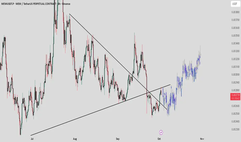 MEW / USDT Breakout confirmed from the descending trendline. Price is retesting the demand zone, and as long as this support holds, we can expect bullish continuation towards higher levels. Breakdown below the zone will invalidate the setup.