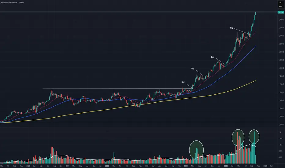 Each pullback to the 10- or 20-week line formed classic bull flags and pennants, providing continuation entries within a larger parabolic curve structure.