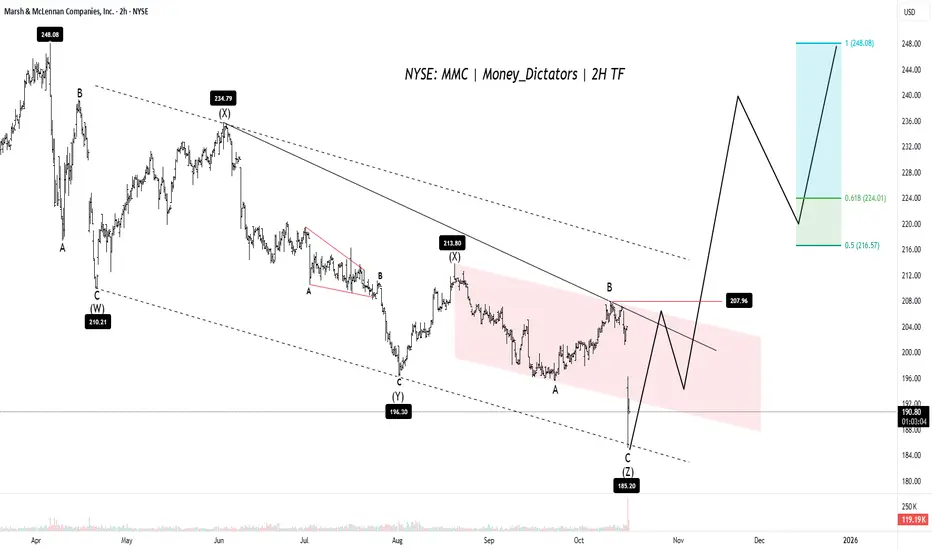 MMC is nearing the end of a recent price drop. The price is currently in its final downward phase, expected to bottom out around $184 to $186. Targets are 219, 234 & 245. Bulls can take control at wave B point(Resistance - $207).