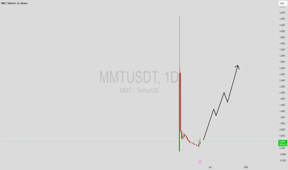 MMTUSDT is forming a clear bullish wave pattern on the daily and 4-hour charts, a powerful continuation signal that underscores surging momentum in the Sui DeFi ecosystem amid late 2025's altcoin volatility. The price has been advancing through a series of higher highs and higher lows around $0.40, reflecting strong buyer conviction following the recent 94% daily pump and buyback program launch that tightened supply dynamics. With good trading volume exploding to over $1 billion in the last 24 hours—dominated by Binance's MMT/USDT pair—the setup signals robust accumulation, as RSI surges past 70 and the wave structure aligns with Momentum's ve(3,3) governance incentives. The projected move could lead to an impressive gain of 290% to 300%+ once the price clears the $0.50 resistance, targeting explosive levels up to $1.60 in the midterm uptrend.