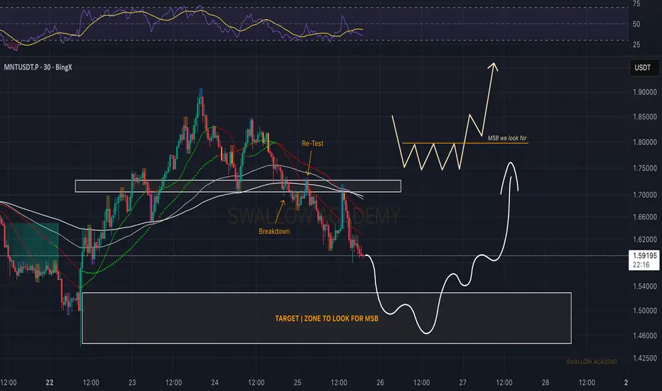 MNT faced a clean breakdown after failing the EMA retest, sending the price lower and keeping sellers in control for now. The zone around $1.50–$1.55 becomes the main target to watch, as this is where we’ll be looking for signs of a proper MSB to confirm a reversal.