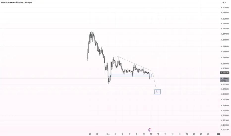 Price has formed a descending triangle with consistent lower highs and a flat support zone. The support level has now been broken, confirming bearish continuation. As long as the breakdown holds, I expect further downside movement toward the $0.020–$0.019 area, which aligns with the next liquidity zone.