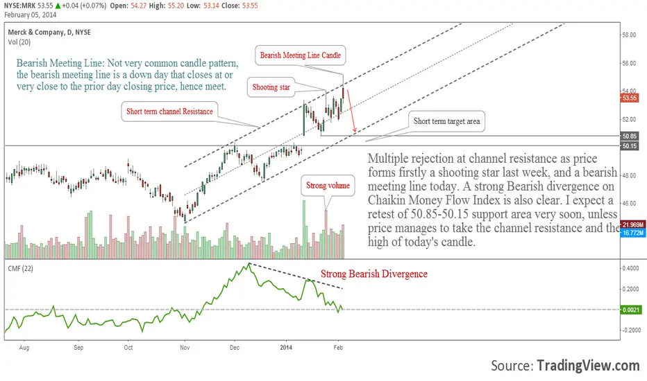 Multiple rejection at channel resistance as price forms firstly a shooting star last week, and a bearish meeting line today. A strong Bearish divergence on Chaikin Money Flow Index is also clear. I expect a retest of 50.85-50.15 support area very soon, unless price manages to take the channel resistance and the high of today's candle.