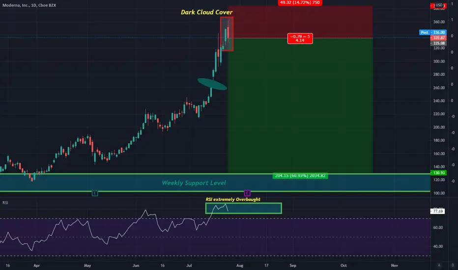 I expect that we will see a daily reversal in MRNA from here in respect to the Dark Cloud Cover candle Close we just got on the daily. At minimum we will see a reversal to fill the gap below but at the worst we will go all the way down to or weekly support level i highlighted in the chart.
