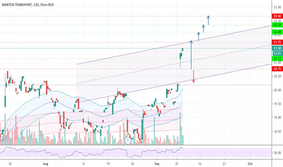 MRTN share prices broke out in today's session with high volume and momentum. Share prices are currently trading at 21.50, heading towards its first target at 21.70. The next goal is estimated at around 22.00 and 22.35. Share prices need to remain above 20.75 to continue its run to the upside.