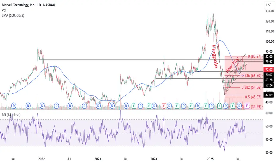 The MRVL chart indicates a bear flag formation, suggesting a continuation of the downtrend from its all-time high of $127.48 in January 2025. After hitting a low of $47.09 in April 2025, the stock consolidated between $47-$85. The recent breach below the sideways channel reflects the bear flag's flagpole, echoing the preceding downward trend.