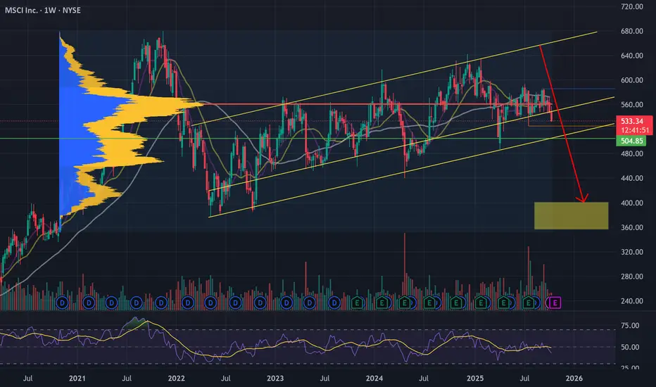 It seems a huge bearish flag forming in the MSCI chart. Selling volumes are high. MSCI is an high quality company and a sharp drop is unlikely but if it will happen...