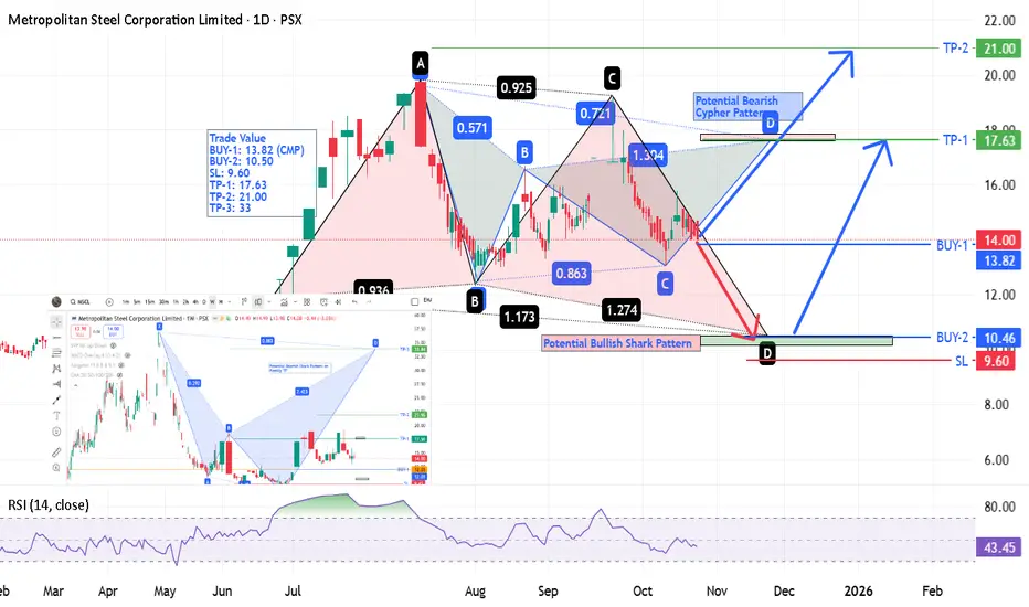 On Daily TF, two harmonic patterns have been drawn. Red is Bullish Shark Harmonic Pattern whose potential target is 10.46; and other is Bearish Cypher Harmonic Pattern whose target is 17.63.