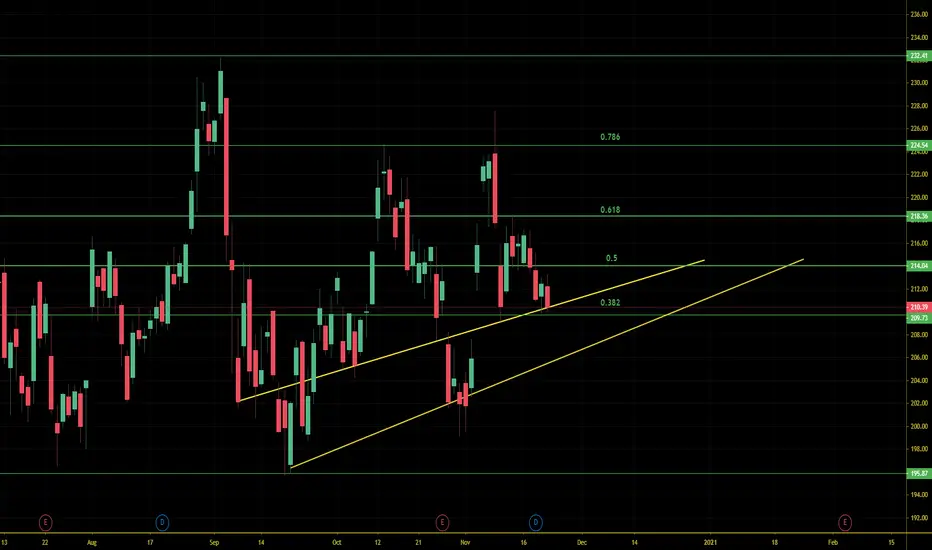 1) If we can't hold above 0.382 fib at $210, I'm buying 12/04 $205 PUTS. Once the lower support keeps $206 in play, 12/04 $210 CALLS. If the lower support fails, then the good news is; we've already got our puts :)