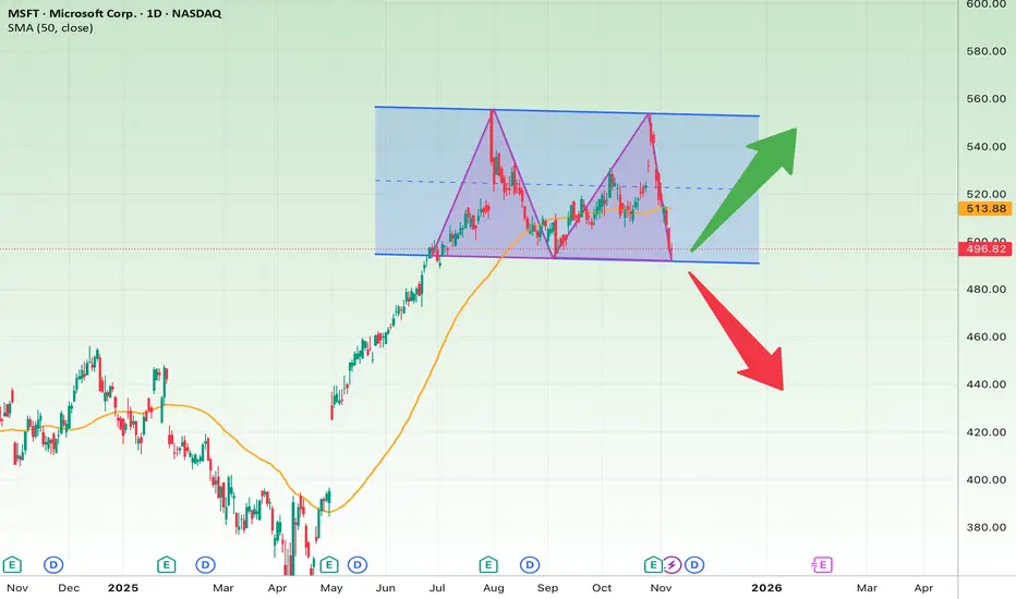 The daily chart of Microsoft (MSFT) shows that the stock is moving within a horizontal range between approximately 495 and 540 dollars, with a potential bearish Double Top pattern forming. The price is currently testing a critical support area that could determine the next major move.