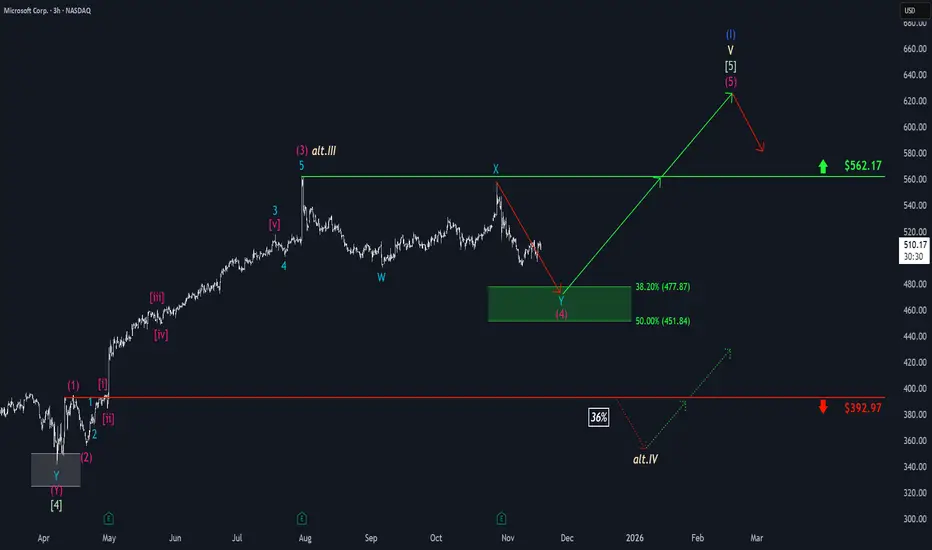 Microsoft shares have continued to show weakness recently, although the stock has shifted into more of a sideways pattern. In the near term, we anticipate another downward move, which should establish the low for wave (4) in magenta within our green Target Zone between $477.87 and $451.84. From our perspective, this range remains attractive for long entries, as we expect a new upward impulse to follow as part of magenta wave (5). This move should push the stock above resistance at $562.17 and complete the larger blue wave (I). Alternatively, there is a scenario in which the high at $562.17 marks the end of beige wave alt.III (probability: 36%). In that case, we would expect a substantial decline below support at $392.97, where the low of wave alt.IV would be found.