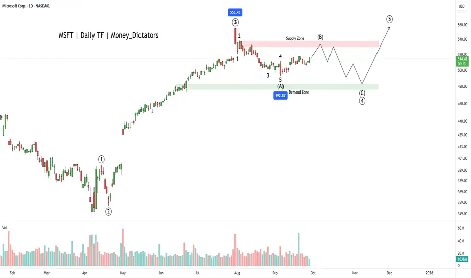 MSFT has bullish signals from the multiple moving averages, RSI and volume analysis. However, wave principle asks evidence from the buyers. The wave count suggests that the corrective wave (B) is ongoing, and bears will control the final wave of the primary wave 3.
