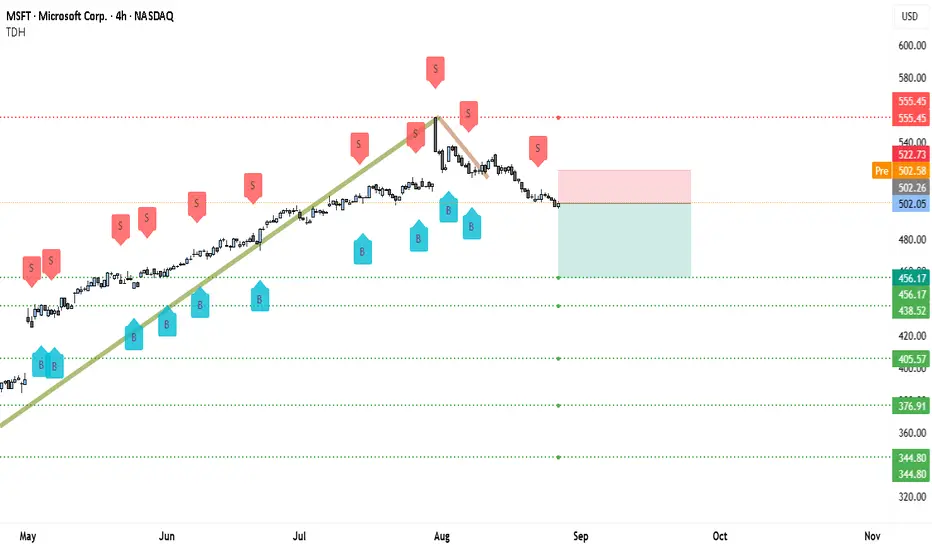In summary, MSFT has transitioned into a bearish phase on the H4 timeframe. A short position around the $500–$505 rejection zone provides a strong risk-to-reward trade setup. With partial profit booking at support levels and disciplined trailing stops, the bearish move can be capitalized on while protecting gains throughout the trend.