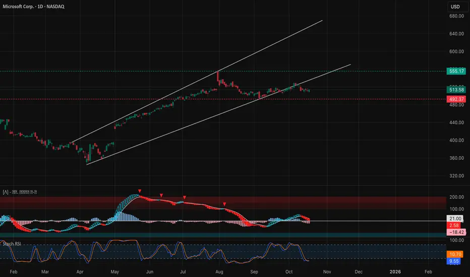 Microsoft’s daily chart remains technically bullish in the larger structure but has clearly lost short-term momentum after peaking in late September. Price is now hovering near the lower boundary of its ascending channel, testing the $510 zone — a crucial level for trend continuation.
