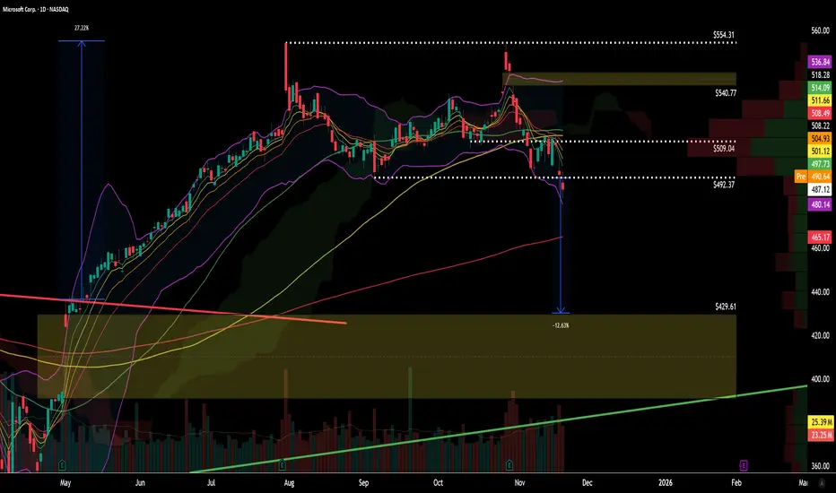 Rejection at $554–$555, a double-top breakdown through $493–$492, confirming volume, and loss of the 5/21/50/100-day MAs all align bearish in the intermediate term.