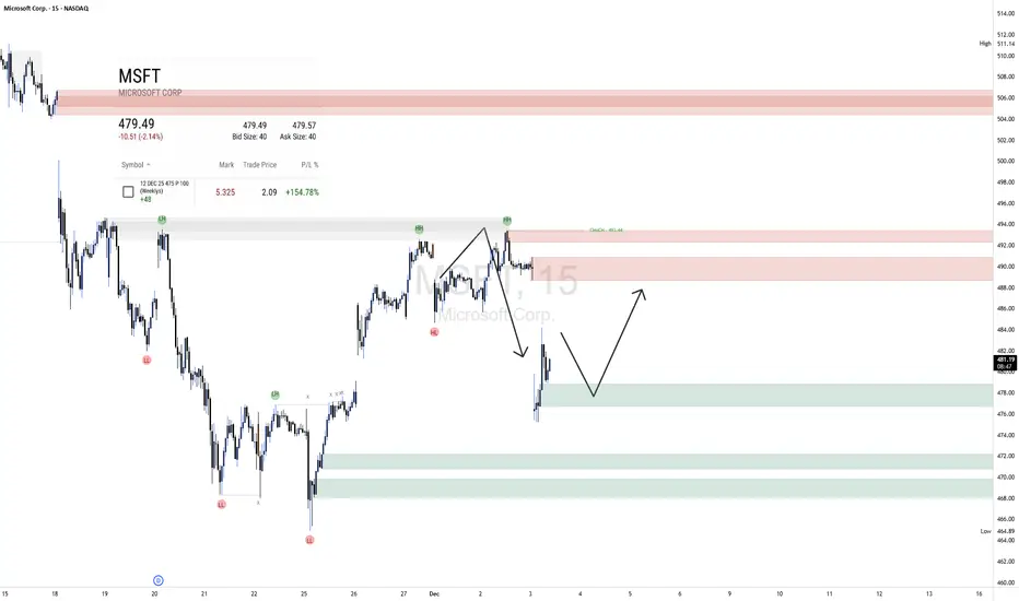 MSFT on the 15-minute chart is in a short-term uptrend following a sequence of higher lows and higher highs from the $464 area. The key structural shift occurred when price printed a CHoCH at $492.44, breaking above the previous swing high and confirming bullish intent. Before that, the market had transitioned from lower lows into a clear higher-low structure, signaling accumulation before expansion. The recent drop from the $492–$494 supply is corrective, not impulsive, which suggests we’re seeing a pullback rather than a reversal unless demand fails.