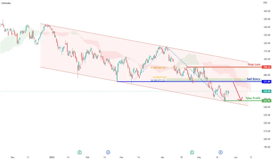 With prices below the ichimoku indicator, we have a bearish bias that price will drop to our take profit at 247.95 where the horizontal swing low support is from our sell entry at 271.89 in line with the horizontal overlap resistance, 61.8% fibonacci projection and 38.2% fibonacci retracement. Alternatively, price may break entry structure and head for stop loss at 290.14 where the horizontal swing high resistance and 61.8% fibonacci retracement are.