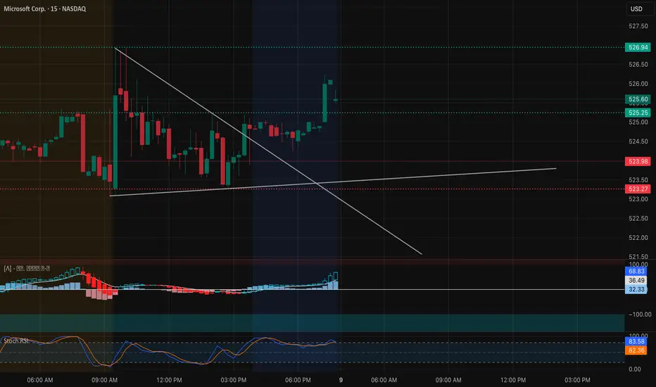 Microsoft (MSFT) is showing a strong bullish reversal after clearing its descending trendline on the 15-minute chart. Price reclaimed $525 support with a solid impulsive candle, confirming a short-term CHoCH followed by upward momentum. The breakout from the compression zone has opened room toward $528โ$531 resistance.