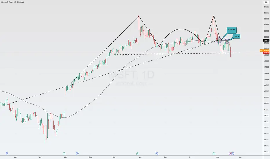 Microsoft is currently playing out a beautiful Batman pattern: having broken through the sloping trendline, retested, and also retested at 50 SMA.