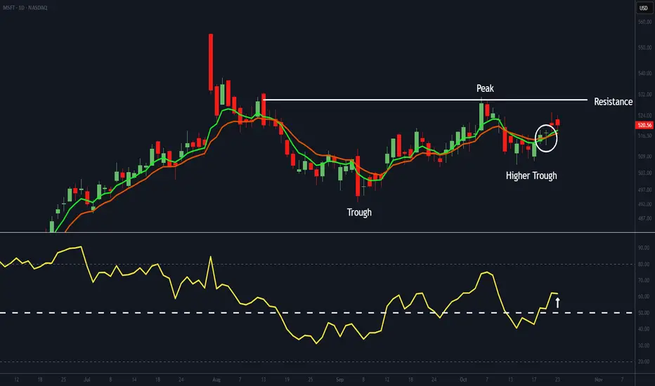 We believe Microsoft (MSFT) has formed a higher trough - a bullish sign. Its EMAs have crossed positively, and the RSI has moved above 50, signalling improving momentum. If the RSI holds above that level, it will confirm a strengthening trend that could see MSFT challenge resistance near $530.