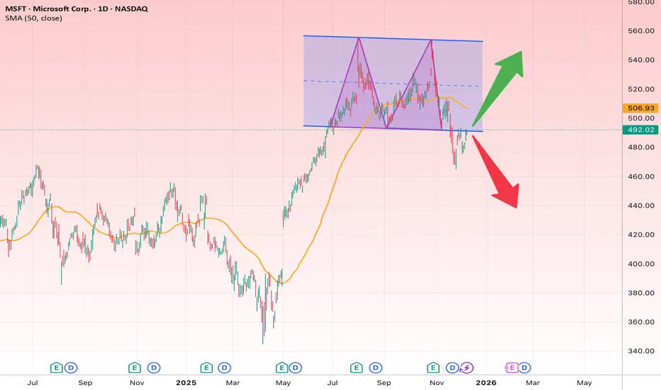 Microsoft has broken down from a distribution range / double top zone and is now forming a critical pullback retesting the broken support. This area will determine the medium-term direction.