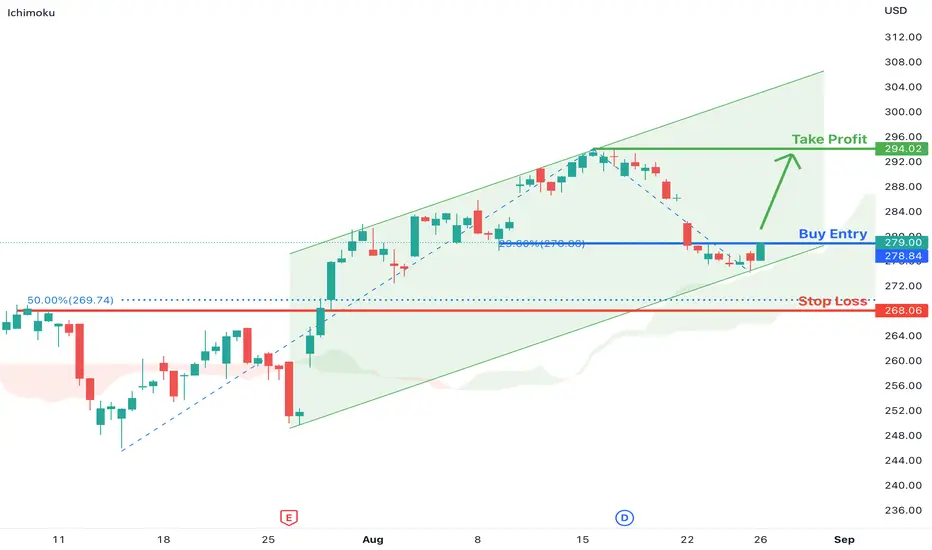 On H4, with the price moving within the ascending channel and above ichimoku cloud, we have a bullish bias that the price may rise form the buy entry at 278.84, where the overlap resistance and 23.6% fibonacci retracement are to the take profit at 294.02, where the swing high is. Alternatively, the price may drop to the stop loss at 268.06, where the pullback support and 50% fibonacci retracement are.