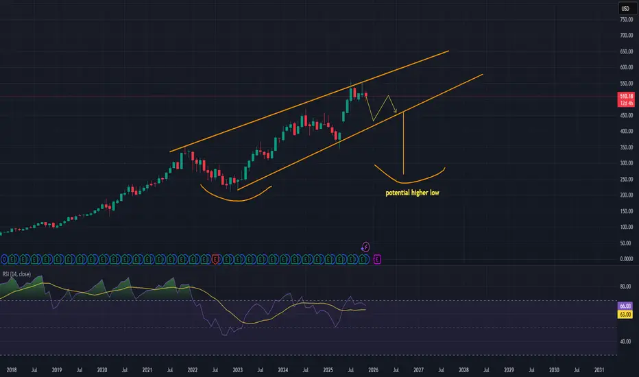 The Higher Low: The projected support at the lower trendline is expected to form a Higher Low relative to the previous major swing low (the curved yellow line at the bottom of the wedge, seen around 2023).