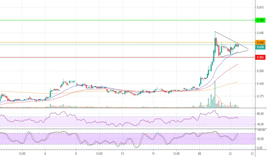 Monitor to buy upon breakout from triangle pattern OR above 0.64 with take profit target at 0.75. Cutloss if fall below 0.565.