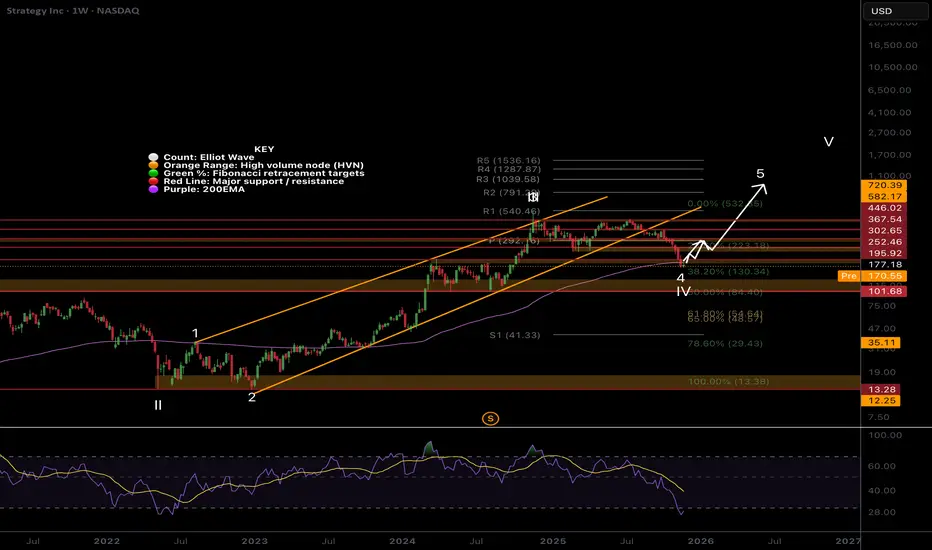 Price hit the weekly 200EMA in wave 4. Not much more to add, there is room to fall to $101 High Volume Node, but a bottom should emerge soon.