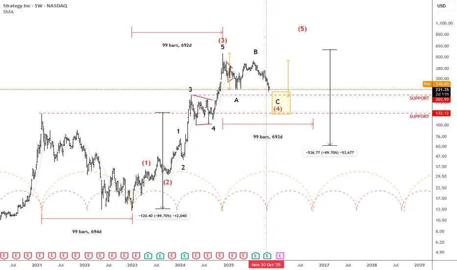 MicroStrategy has seen a strong uptrend since the December 2022 lows, but over the last year the market has been in a retracement phase. It appears that this could be another A-B-C setback within a higher-degree wave four, where subwave C could potentially retest the 200 area, or even extend toward the deeper 132 support. That level also aligns with the February 2021 high, making it an important zone to watch.